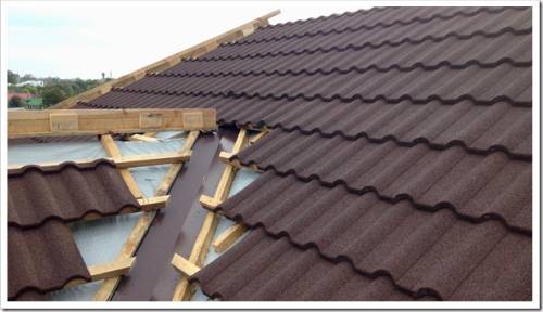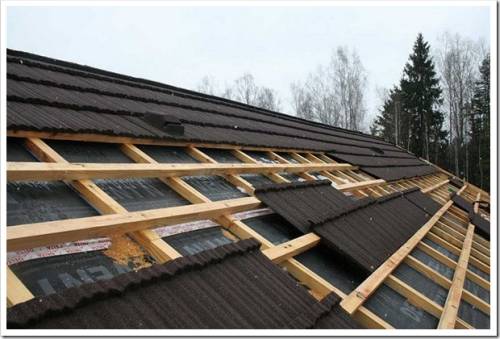 Композитная черепица крепится заподлицо с торцом обрешётки. Нужно помнить о том, что вверх на 90 градусов отгибается приблизительно 3-4 миллиметра. После этого к ветровой доске крепится обрешётка. Крепёж планок торца производится с нижней части в верхнюю. Торец снизу необходимо закрепить заглушкой и обработать при помощи герметика.