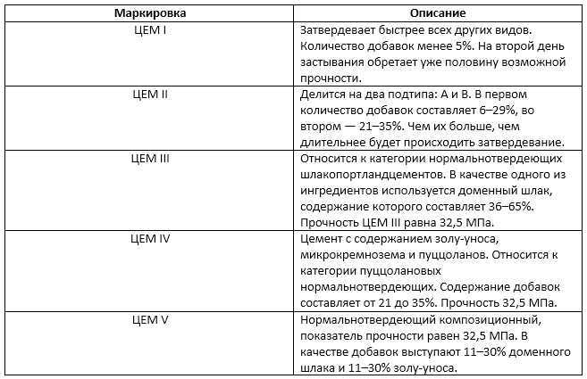 Определение показателя скорости затвердевания конкретного вида цемента — дело несложное. Необходимая информация указана в маркировке. Существуют следующие типы, которые мы свели в таблицу.